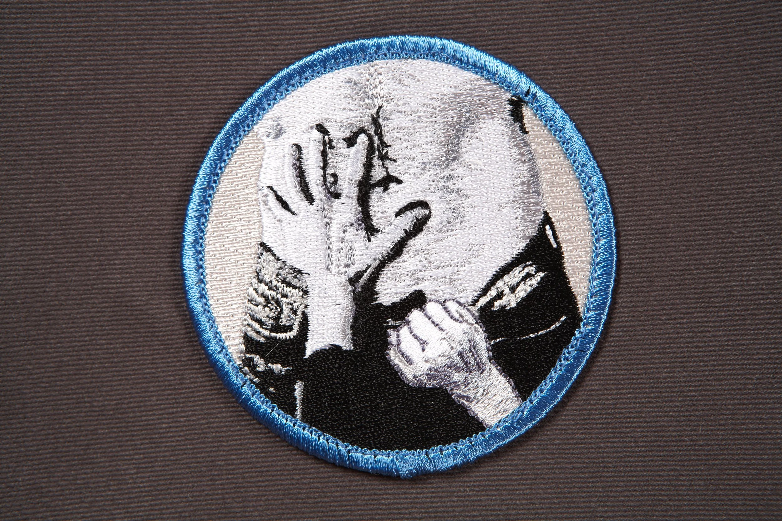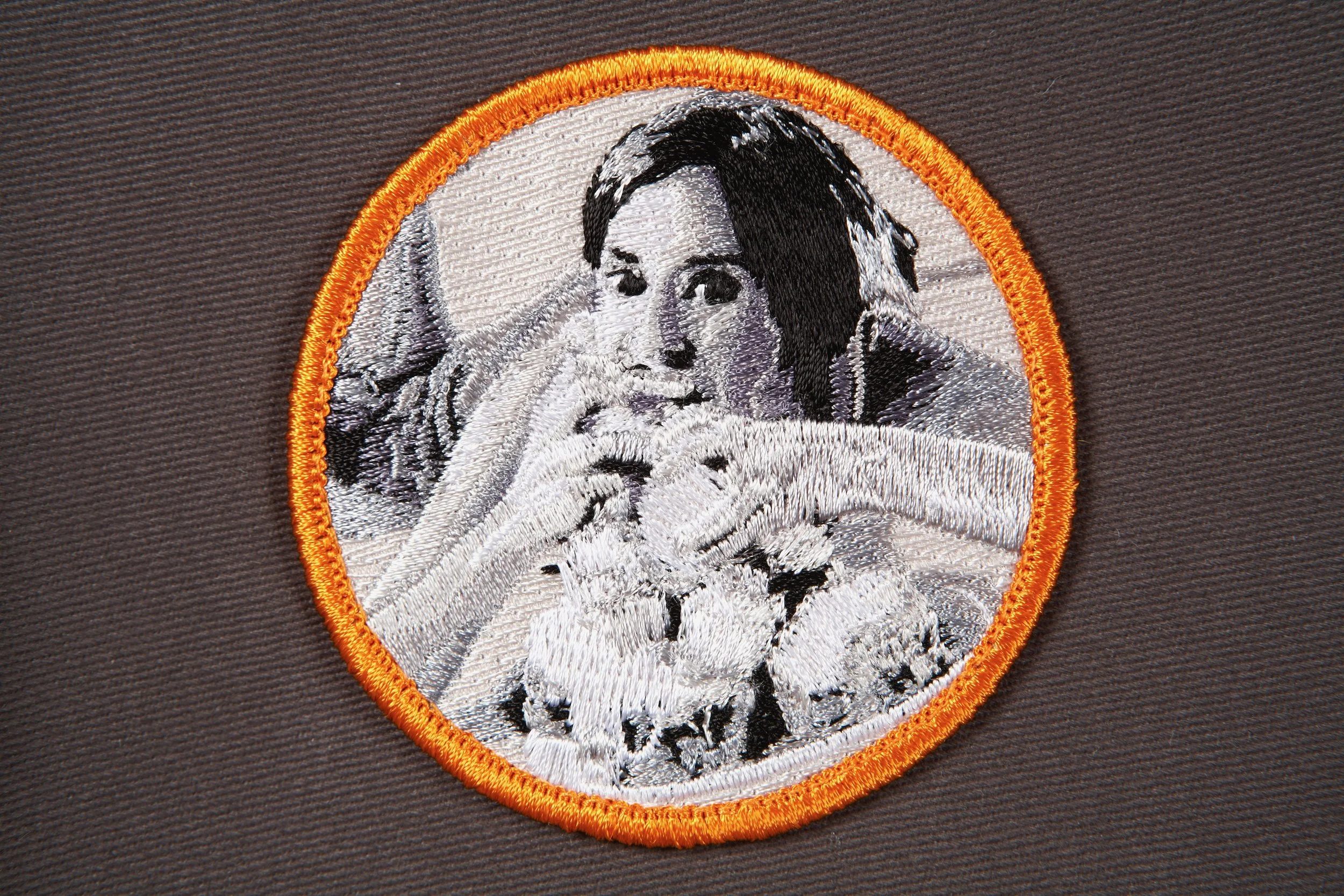 Silva’s most recent edition of “wearable art” recalls girl-scout sashes decorated with badges denoting series of achievements. The Badger series display, on individual round badges, the artist performing the seven deadly sins. The theme explored in Natural Selection is reiterated here albeit with a lightheartedness that marks an overcoming of domination through accusations. Guilt is the catalyst that enables pleasure to be transformed into sin. Badger, then, takes on aspects of an invisible armor that works by rendering accusatory badgering ineffective.